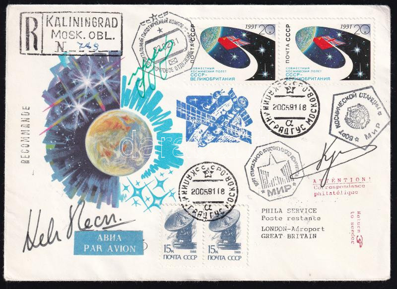 Leírás: Helen Sharman (1963- ) brit, , Anatolij Arcebarszkij (1956- ), Szergej Krikaljov (1958- ), Alekszandr Volkov (1948- ) szovjet űrhajósok aláírásai emlékborítékon / Signatures of Helen Sharman (1963- ) British, Sergei Krikalyov (1958- ), Aleksandr Volkov (1948- ) Soviet astronauts on envelope