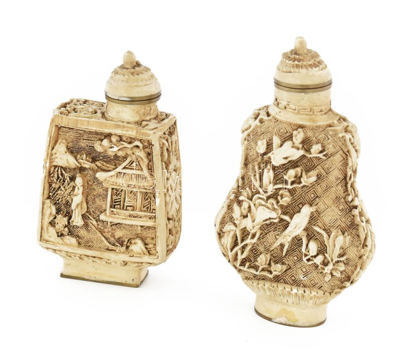 Leírás: 2 darab kínai faragott tubákos fiola, jelzett, kopással, m: 6-8 cm