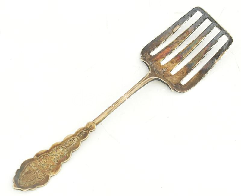 Leírás: Antik ezüstözött süteménykanál. Jelzett, kopással, h: 15,5 cm