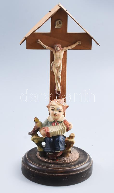 Leírás: Asztali kegytárgy. Fa, festett fém, kopással, laza, m: 23 cm
