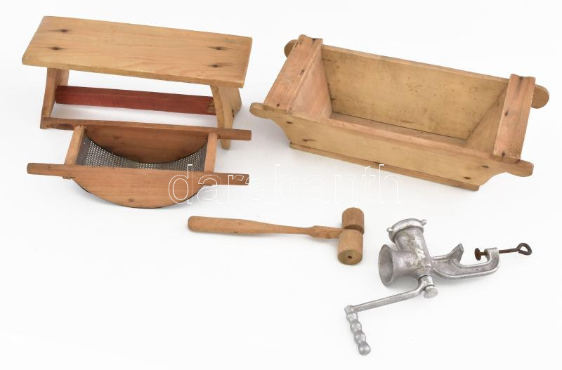 Leírás: 5 darab retro gyermekjáték használati tárgy, közte alumínium Mofém húsdaráló