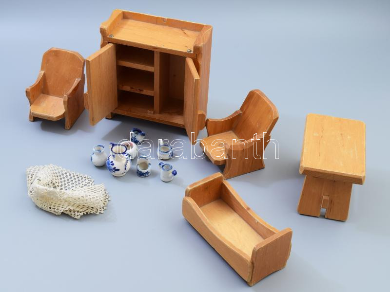 Leírás: Babaház bútor szett, hozzá babaház porcelánokkal.