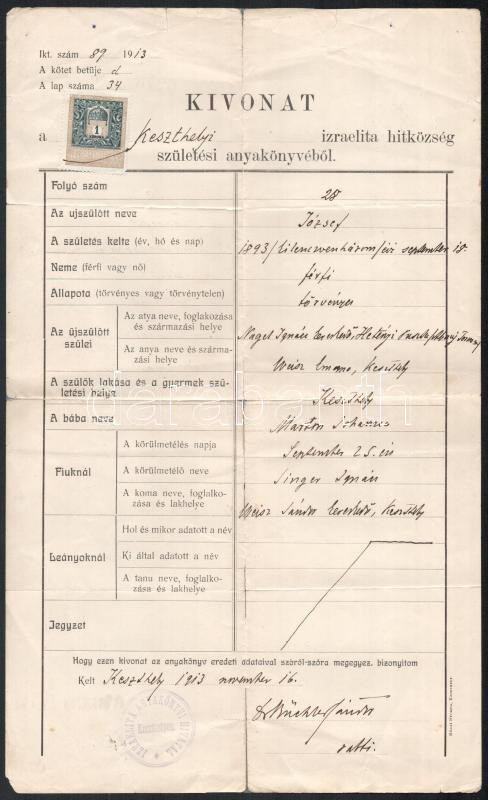 1913 Kivonat Keszthelyi Izraelita Hitközség anyakönyvéből, rabbi aláír... https://www.darabanth.com/hu/477-Gyorsarveres/477.0/Mutargy-papirregiseg-egyeb/Judaika~2000005/1913-Kivonat-Keszthelyi-Izraelita-Hitkozseg-anyakonyvebol-rabbi-alairassal~II3253159