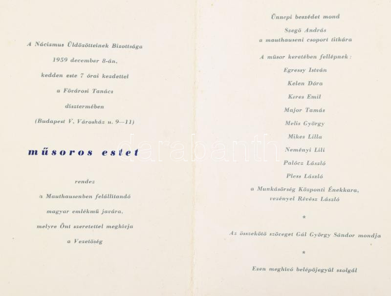 Leírás: 1959 Nácizmus Üldözötteinek Bizottsága meghívója, hiányos sarokkal.