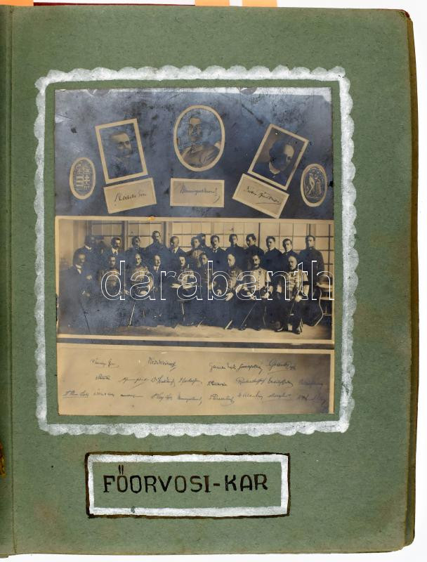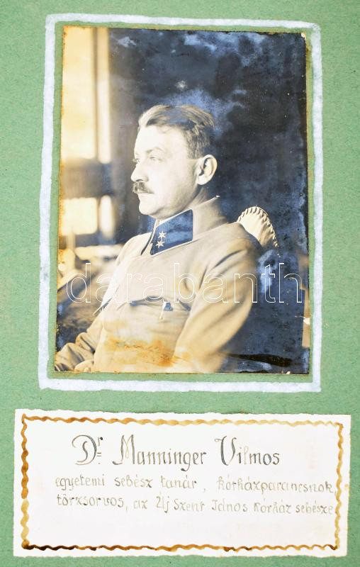 1916 Karácsony - A Pénzintézetek Hadikórházának főorvosai. Emlékalbum összesen 64 db fotóval (beragasztva, a képek alatt kézzel feliratozva), a képeken a főorvosi kar, Dr. Manninger Vilmos (1876-1945) sebész, kórházparancsnok, a Szent János Kórház sebész főorvosa; Guszmann József (1875-1956) bőrgyógyász, az urológiai osztály vezetője (valamint más neves orvosok); Zita királyné látogatása a Pénzintézetek Hadikórházánál; orvosok, katonatisztek dedikált képei; nővérek; stb. Dekoratív, aranyozott egészvászon-borítású, zsinórfűzéses albumban, nagyrészt jó állapotban, a lapok egy része kijár az albumból, 24,5x20 cm