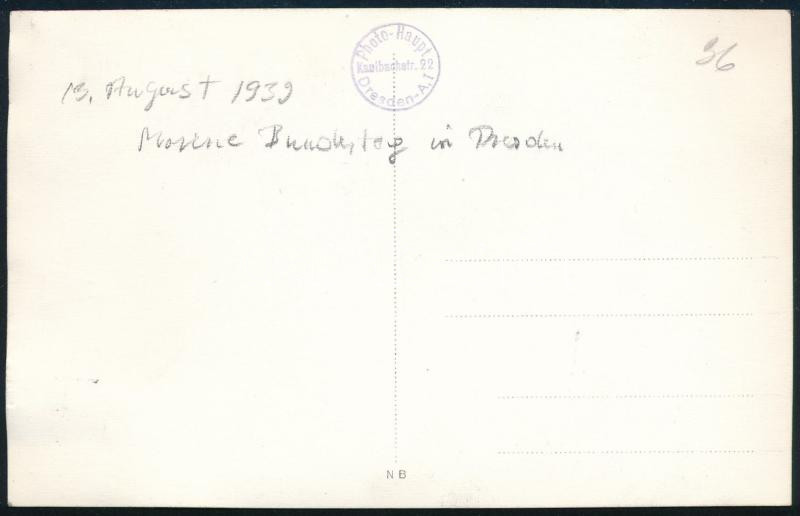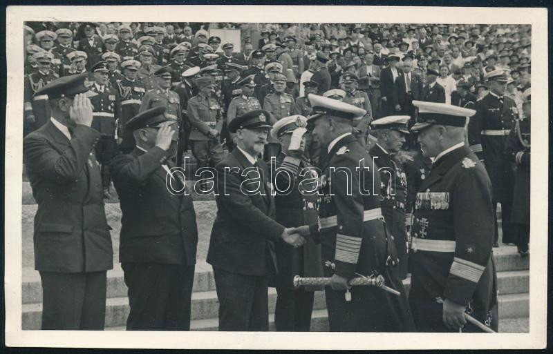 1939 A német haditengerészet napja, ünnepi rendezvény Drezdában, a magyar küldöttséget üdvözli Erich Readel (1876-1960) nagymarsall, a haditengerészet vezetője, itt kezet fog Skripecz Dezső (1887-1948) ny. főkapitánnyal, a Magyar Haditengerészeti Egyesület főtitkárával, eredeti fotó, hátoldalt pecsételve, feliratozva, 9×14 cm