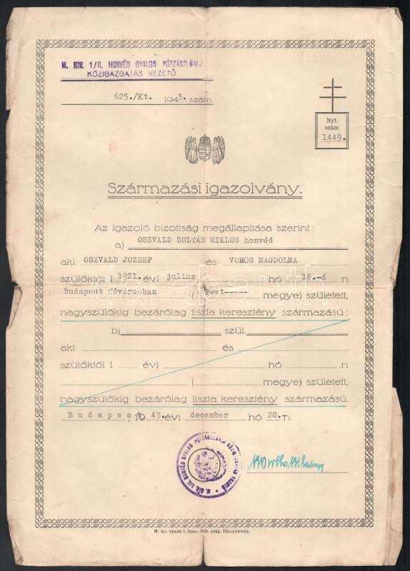 1943 Származási igazolvány Oszvald Zoltán Miklós honvéd részére, "M. kir. 1/II. honvéd gyalog pótzászlóalj közigazgatás vezető" bélyegzéssel, kissé viseltes állapotban