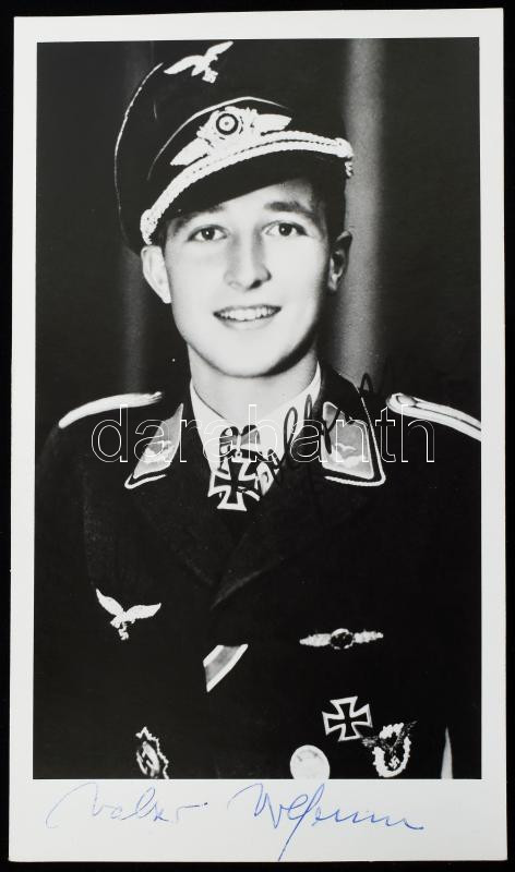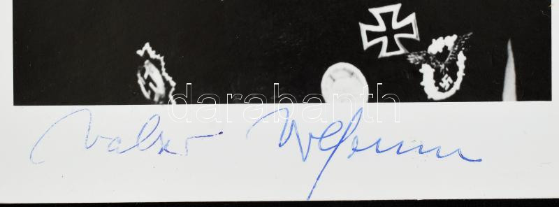 Walter Wolfrum (1923-2010) német Luftwaffe pilóta, repülő ász (137 légi győzelem), a Vaskereszt Lovagkeresztjének kitüntetettje autográf aláírása őt ábrázoló képen (későbbi előhívás), 20x11,5 cm / Autograph signature of Walter Wolfrum (1923-2010) German Luftwaffe pilot, fighter ace (137 aerial victories), recipient of the Knight's Cross of the Iron Cross, on a photo (later copy), 20x11.5 cm