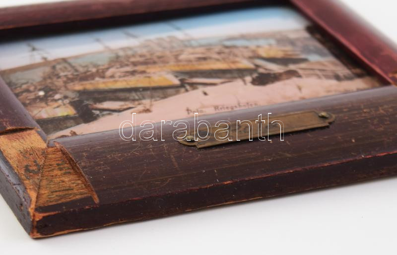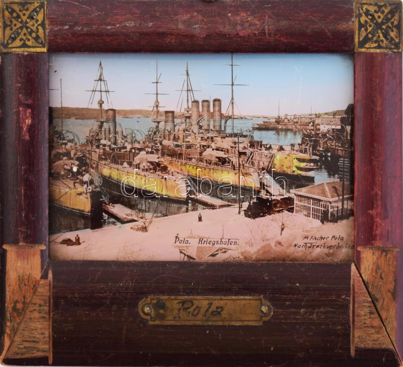 cc 1900 Pola az osztrák-magyar haditengerészet hadihajói a kikötőben, gyöngyház bevonatú fotó kissé sérült fa keretben 12x10 cm / cc 1900 Pola warships of the Austro-Hungarian navy in the harbor, mother-of-pearl coated photo in a slightly damaged wooden frame 12x10 cm