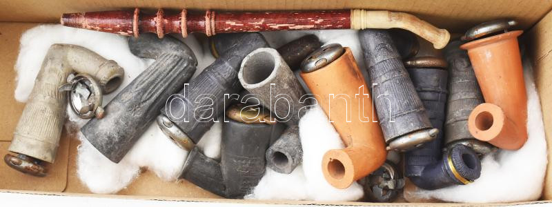 Leírás: 11 db debreceni pipagyárban készült cseréppipa, fém szerelékkel. hozzá szár, sérüléssel, h: cca 5-7 cm