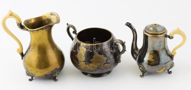 Leírás: 3 db Ambrózy Gerogina bárói koronás monogrammal díszített kiöntő. Réz, csont fogóval. Egyiken hiányzó gomb XIX. sz. 20 cm-ig