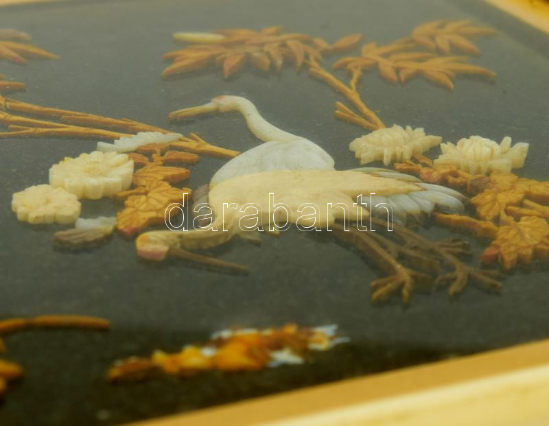 Leírás: Faragott csont és gyöngyház berakásokból álló kínai kép, üvegezett fa keretben, 1-1 elemhiánnyal, teljes méret 31x39 cm