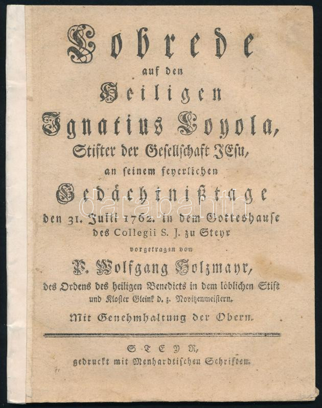 1762 Holzmayr, Wolfgang (1720-1791): Lobrede auf den Heiligen Ignatius Loyola, Stifter der Gesellschaft Jesu, an seinem feyerlichen Gedächtnißtage den 31. Julii 1762. in dem Gotteshause des Collegii S. J. zu Steyr, voergetragen von - - [...] Steyr, [1762], Menhardtischen Schriften, 31 p. Német nyelven. Papírkötésben, javított gerinccel, helyenként kissé foltos.