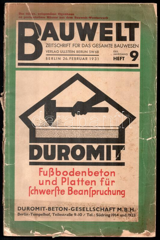 1931 Bauwelt, Zeitschrift für das gesamte Bauwesen, XXII. Jahrgang, Heft 9. Német nyelvű építészeti folyóirat egy száma, fekete-fehér illusztrációkkal, hirdetésekkel. Kiadói papírkötés, sérült borítóval.