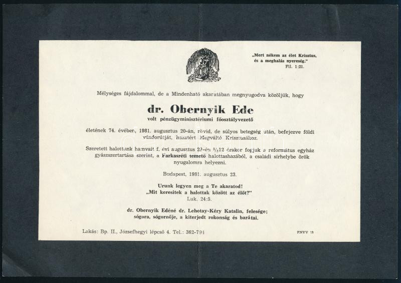 Leírás: 1981 Bp., Dr. Obernyik Ede volt pénzügyminisztériumi főosztályvezető halotti értesítője