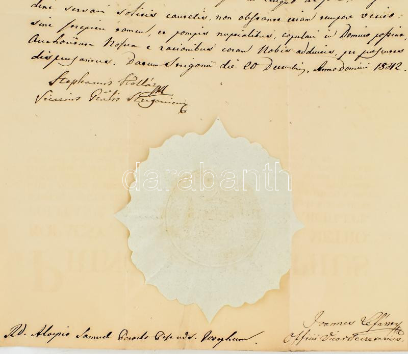 Leírás: 1842 Kollár István (1764-1844) királyi tanácsos, kanonok, tribunici választott püspök, nagyprépost által aláírt latin nyelvű okirat, papírfelzettel
