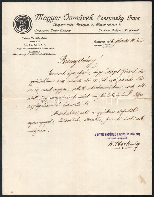 Leírás: 1915 Bp., Magyar Ónművek Lossinszky Imre cégének fejléces papírjára írt bizonyítvány
