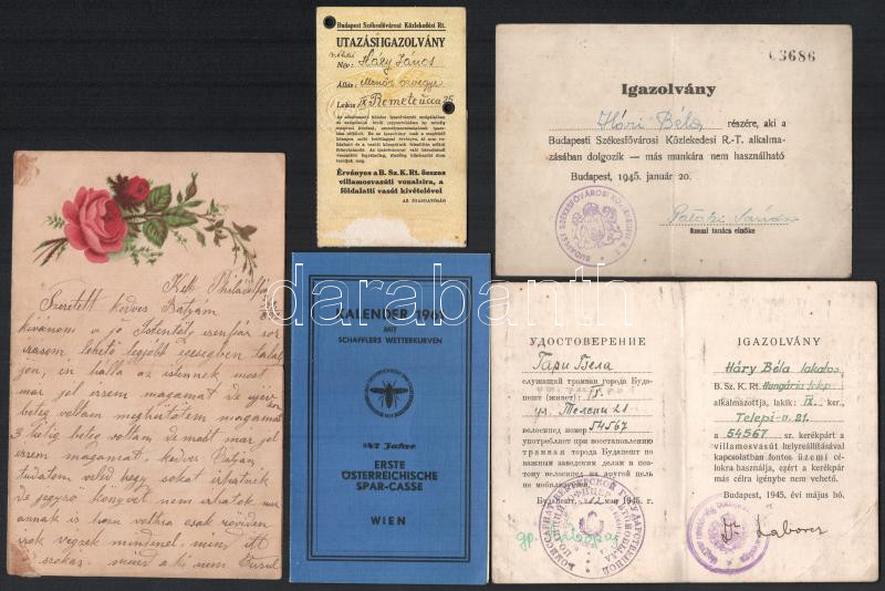 Leírás: cca 1920-1945 Vegyes okmány tétel, benne BSZKRT fényképes bérlet, kétnyelvű mentesítő igazolvány BSZKRt alkalmazott részére