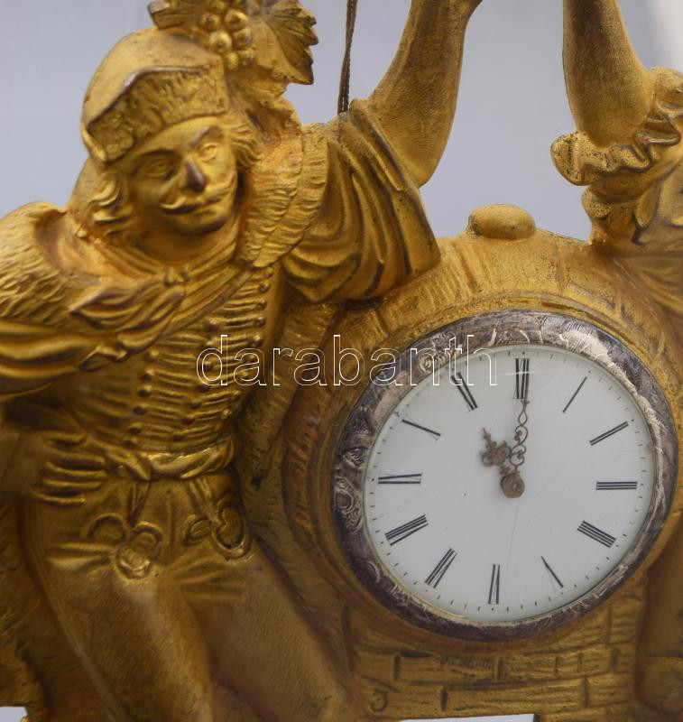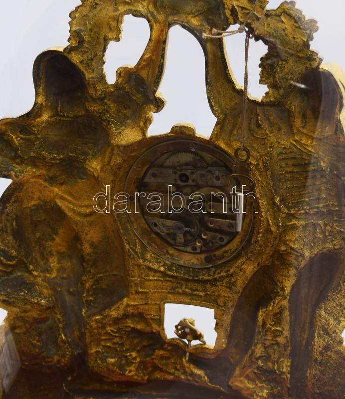 Asztali óra. Magyaros jelenettel. Hochzeituhr. XIX. sz vége. Aranyozott fém. Kulcsos óraszerkezet. Kulcssal, működik. Fújt üveg búra. Proveniencia: Ernst Lajos gyűjteményéből m: 28 cm
