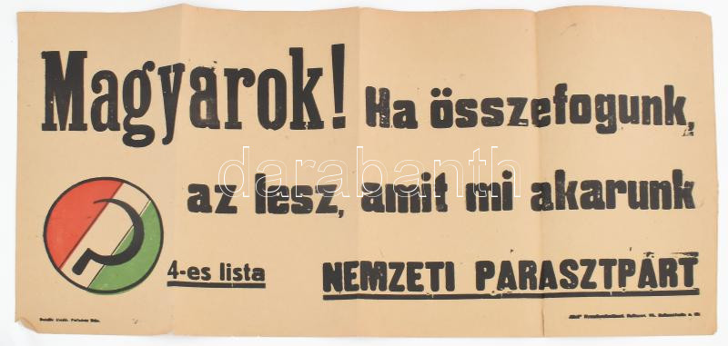 Leírás: 1947 "Magyarok! Ha összefogunk, az lesz, amit mi akarunk" - a Nemzeti Parasztpárt választási plakátja, hajtásnyommal, szakadással