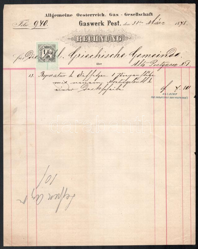 Leírás: 1878 Pesti gázművek (Gaswerk, Pest) fejléces számla