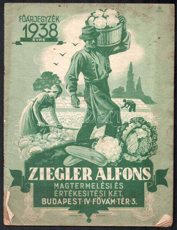 1938 Ziegler Alfons Magtermelési és Értékesítési Kft. főárjegyzék az 1938. évre. Bp., Hornyánszky-ny., 40 p. Fekete-fehér képekkel illusztrálva. A borító Pál György munkája. Kiadói tűzött papírkötés, kissé foltos, sérült borítóval, helyenként kissé sérült, foltos lapokkal.