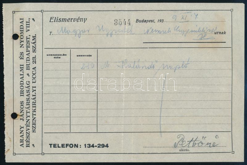 Leírás: 1939 Arany János Irodalmi és Nyomdai Részvénytársaság fejléces számla