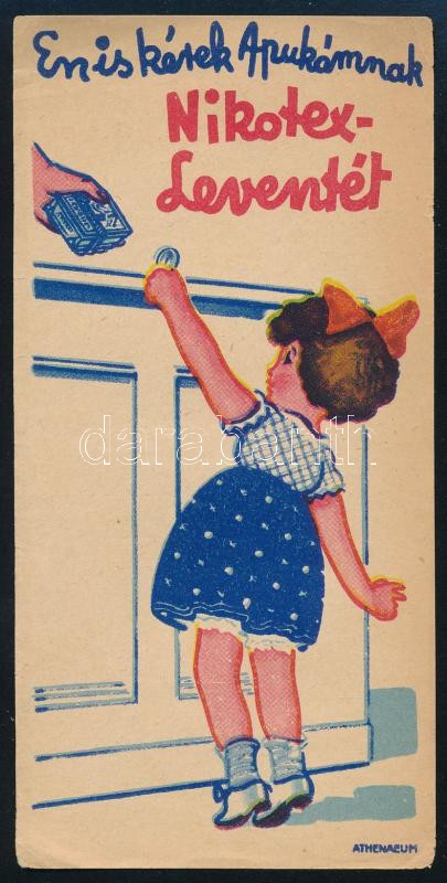 "Én is kérek Apukámnak Nikotex-Leventét" számolócédula. https://www.darabanth.com/hu/477-Gyorsarveres/477.0/Mutargy-papirregiseg-egyeb/Reklam~2000002/En-is-kerek-Apukamnak-Nikotex-Leventet-szamolocedula~II3190744