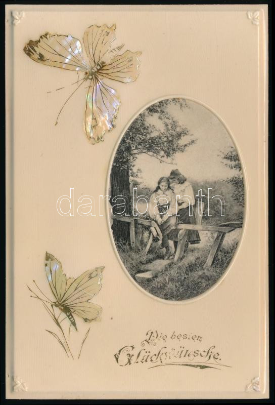 Leírás: cca 1900 "Die besten Glückwünsche", régi plasztron üdvözlő kártya, 15x10 cm