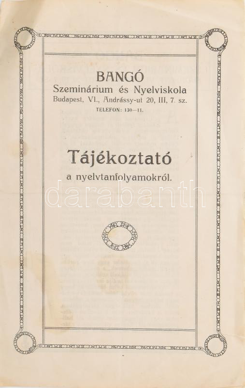 Leírás: cca 1910 Bangó szeminárium és nyelviskola tájékoztató nyelvtanfolyamokról 4p.