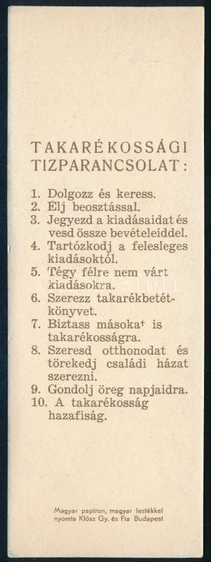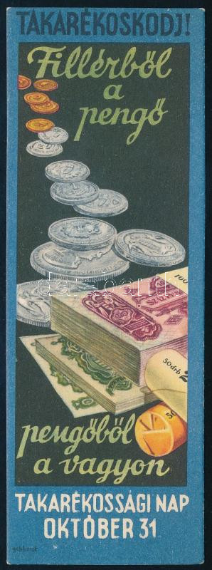 Leírás: cca 1930 Fillérből pengő, pengőből vagyon, takarékossági könyvjelző, szign. Gebhardt, Klösz nyomás, szép állapotban