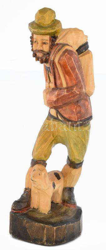 Leírás: Vadász kutyájával. Faragott fa szobor, m: 40 cm