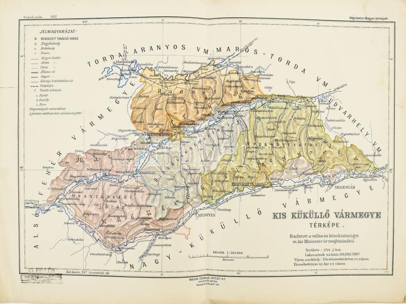 1911-1913 Alsó-Fehér vármegye és Kis-Küküllő vármegye térképe (2 db), Kogutowicz: Megyei térképek, Bp., Magyar Földrajzi Intézet R.T., kissé viseltes állapotban, 25x34,5 cm és 35x44,5 cm cm