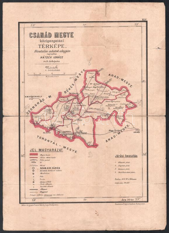 cca 1880-1890 Csanád megye közigazgatási térképe, rajzolta: Hátsek Ignác, 1 : 500.000, Bp., Rautmann Frigyes kiadása (Posner Károly Lajos-ny.), kissé sérült, foltos, ceruzás kiegészítésekkel, 38x27 cm