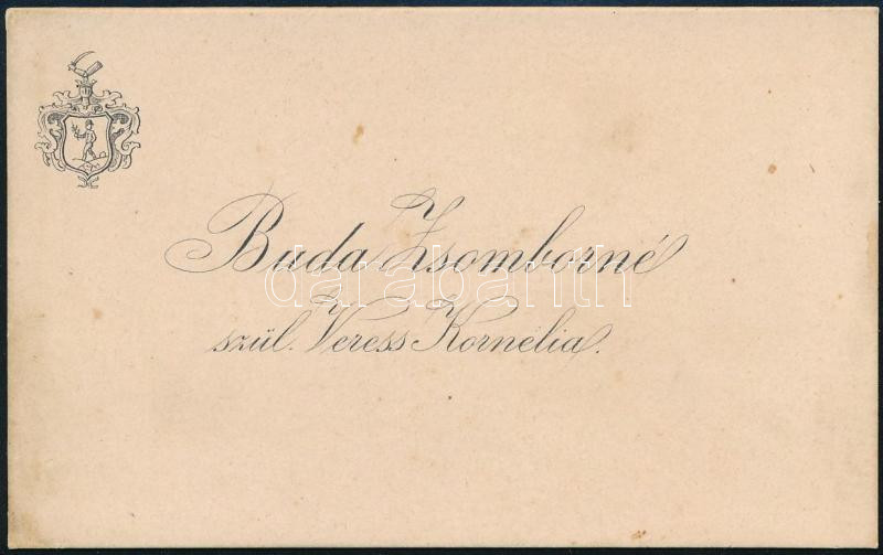 Leírás: cca 1900 Buda Zsomborné Veress Kornélia címeres névjegykártyája, hátoldalán autográf soraival, 9×6 cm