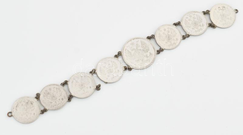 Leírás: Ezüst (Ag) érmék felhasználásával készült karkötő, 20 kopek 1915 + 6 darab 10 kopek 1913-1914, sérült réz szerelékkel, bruttó: 17,7g