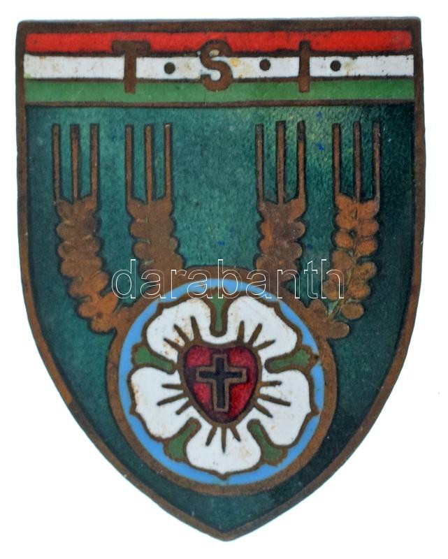 Leírás: ~1900. "TSI" zománcozott bronz evangélikus iskolai sapkajelvény (30x40mm) T:AU kis zománchiba
