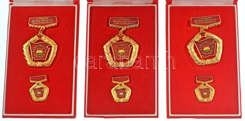 Leírás: ~1970-1980. "A Magyar Népköztársaság Kiváló Brigádja - Szocialista Brigád" (12x) aranyozott, műgyantás jelvények miniatűrrel, eredeti tokokban T:AU