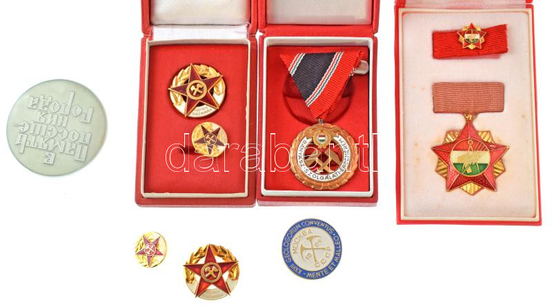 9db-os vegyes magyar és külföldi szocialista kitüntetés, jelvény, emlékérem tétel, közte ~1960. "A Bányászat Kiváló Dolgozója" aranyozott, műgyantás jelvény miniatűrrel, dísztokban T:AU-XF