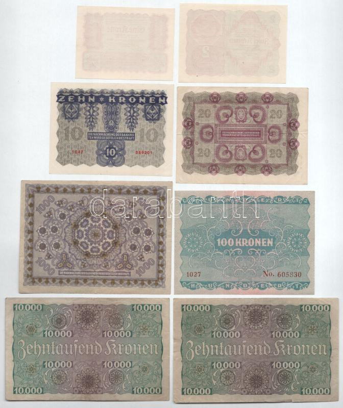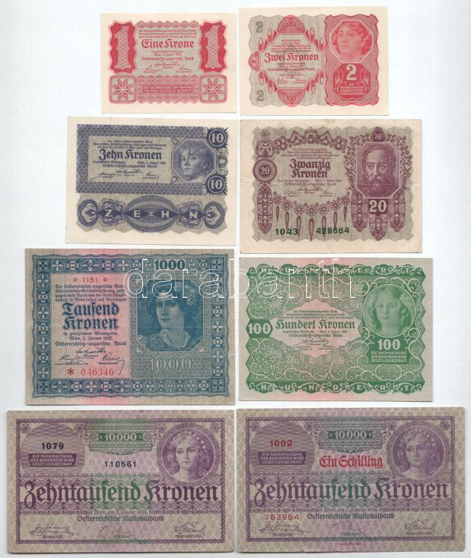 Austria 1922. 1 Kronen + 1922. 2 Kronen + 1922. 10 Kronen + 1922. 20 Kronen + 1922. 100 Kronen + 1922. 1000 Kronen + 1924. 10.000 Kronen (2xdiff) which of one with black serial number, the other is II. issue with "Ein Schilling" overprint C:UNC-F