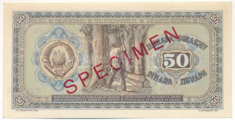 Yugoslavia 1946. 50 Dinara, 8-digit serial number with red "SPECIMEN" overprint C:UNC-AU
