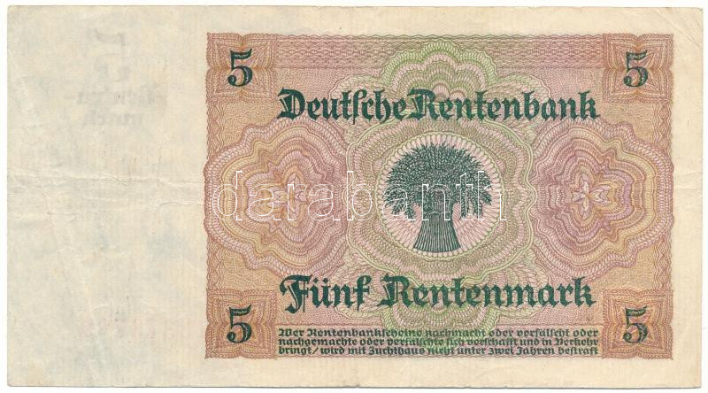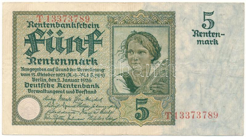 Leírás: Németország / Weimari Köztársaság 1926. 5M "T 13373789" T:F Germany / Weimar Republic 1926. 5 Rentenmark "T 13373789" C:F Krause 169