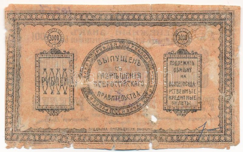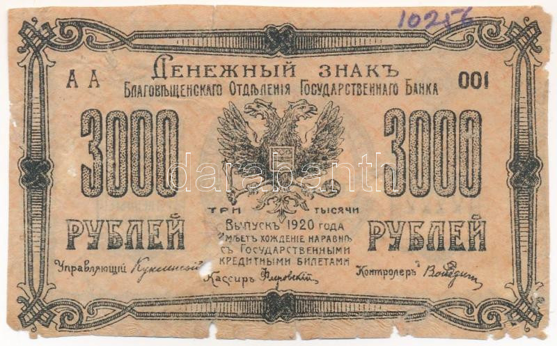 Orosz Polgárháború / Kelet-Szibéria / Blagoveshchensk 1920. 3000R T:VG... https://www.darabanth.com/hu/477-Gyorsarveres/477.0/Numizmatika/Kulfoldi-bankjegyek~500016/Orosz-Polgarhaboru-Kelet-Sziberia-Blagoveshchensk-1920-3000R-TVG-lyuk-kopott-papir-Russi~II3250439