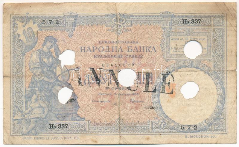 Serbia 1893. 10 Dinara cancelled with holes and with "ANNULE' overprint C:F-VG spot