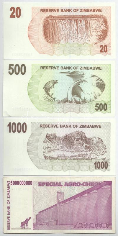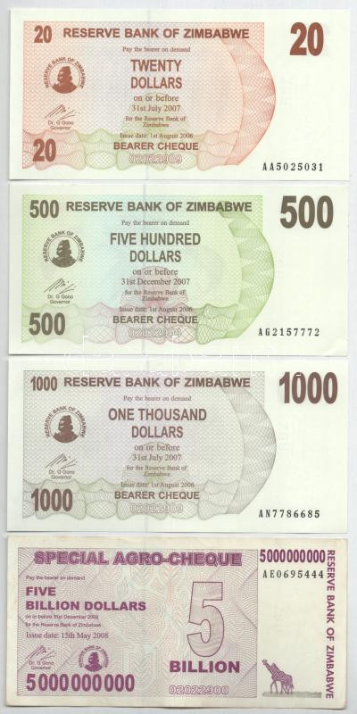 Zimbabwe 2007. 20 Dollars + 500 Dollars + 1000 Dollars + 2008. 5.000.000.000 Dollars nominal value special agro-cheques C:AU in it one F