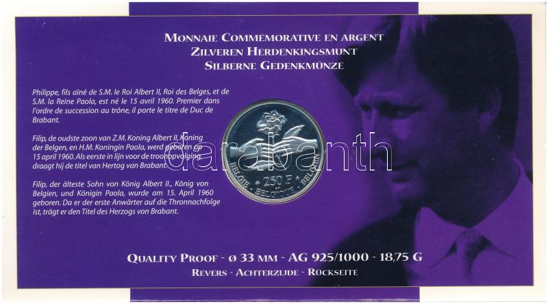 Belgium 1999. 250Fr Ag "Matild és Fülöp esküvője" díszlapon T:PP Belgium 1999. 250 Francs Ag "Marriage of Mathilde and Philippe" on cardboard C:PP Krause KM#218