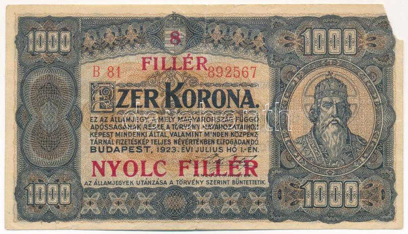 1923. 1000K "8 FILLÉR - NYOLC FILLÉR" felülbélyegzéssel, nyo... https://www.darabanth.com/hu/477-Gyorsarveres/477.0/Numizmatika/Magyar-bankjegyek~500009/1923-1000K-8-FILLER-NYOLC-FILLER-felulbelyegzessel-nyomdahely-jeloles-nelkul-TF-VG-~II3243139