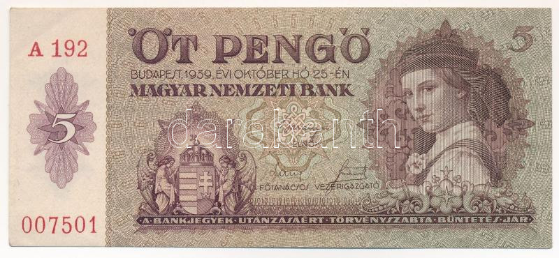 1939. 5P "A 192 007501" T:AU bal felső sarokban nagyobb saro... https://www.darabanth.com/hu/477-Gyorsarveres/477.0/Numizmatika/Magyar-bankjegyek~500009/1939-5P-A-192-007501-TAU-bal-felso-sarokban-nagyobb-sarokhajlas-Adamo-P6~II3249584