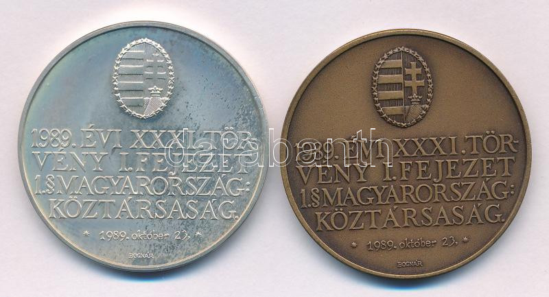 Bognár György (1944-) 1990. "Magyar Éremgyűjtők Egyesülete / 1989. évi XXXI. törvény I. fejezet 1§ Magyarország: Köztársaság. - 1989. október 23." Ag és bronz emlékérem pár (36g/0.835/42,5mm) T:UNC,AU (eredetileg PP)