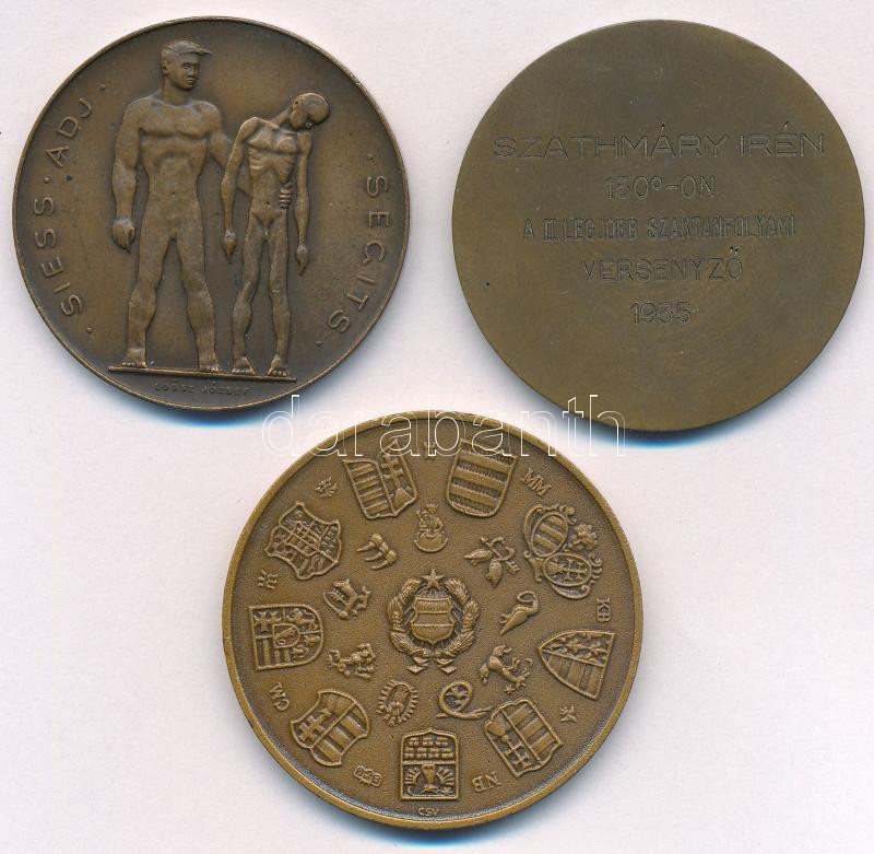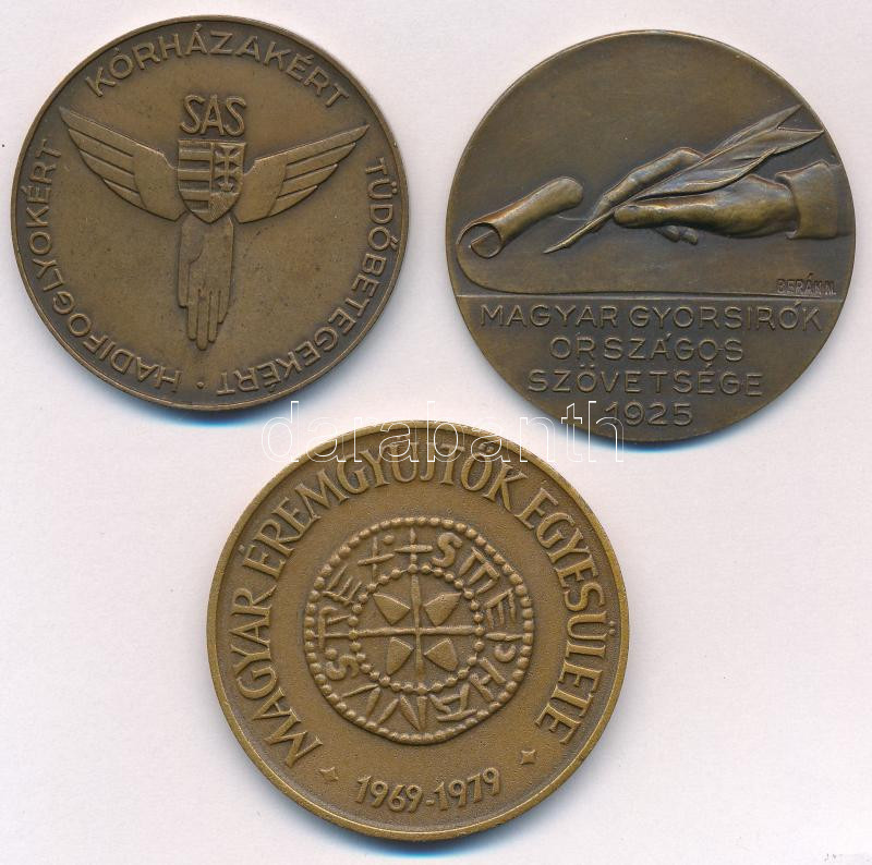Leírás: Loósz József (1908-1985) 1947. "SAS Kórházakért Hadifoglyokért Tüdőbetegekért / Siess Adj Segíts " (40mm) + Berán Nándor (1889-1965) 1935. "Magyar Gyorsírók Országos Szövetsége" (42mm) + Csúcs Viktória (1934-1993) 1979. Magyar Éremgyűjtők Egyesülete kétoldalas bronz érem (42,5mm) (3xklf) T:AU